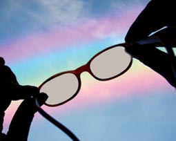 Okulary monochromatyczne, dające szary obraz tęczy.
